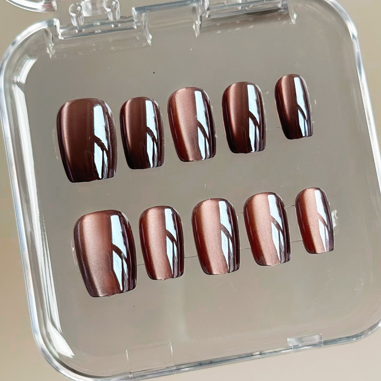 Chameleon cat eye effect shifts from deep burgundy to warm bronze, dotted with subtle holographic micro-shimmers. Each set is a quiet luxury indulgence—where the soft, shifting glow clings to almond tips, weaving understated glamour into every daily moment, no salon effort needed.