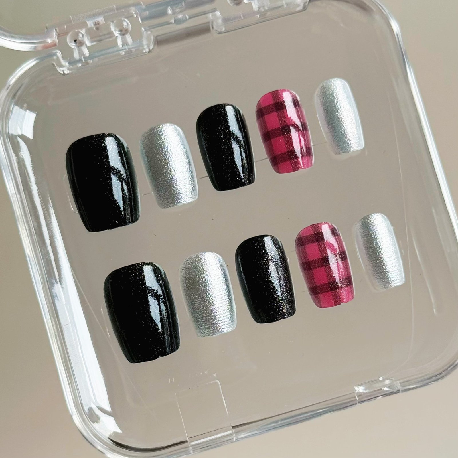 This set blends glossy black glitter, textured silver shimmer, and bold red plaid designs—each nail tells a part of winter’s story. From sleek sparkle to cozy checkered charm, it’s like wearing a festive, edgy ensemble on your fingertips, perfect for holiday parties or chilly-season style.