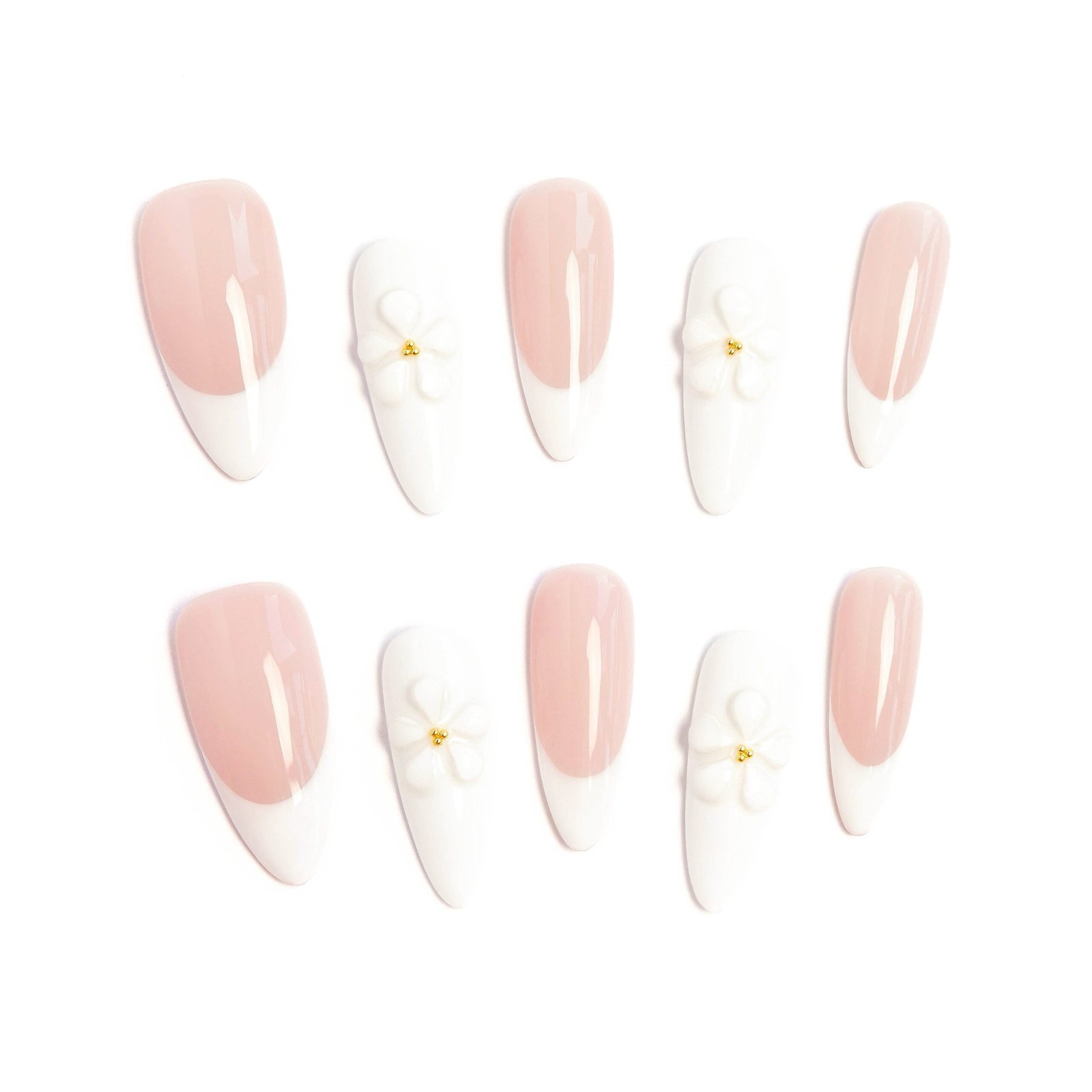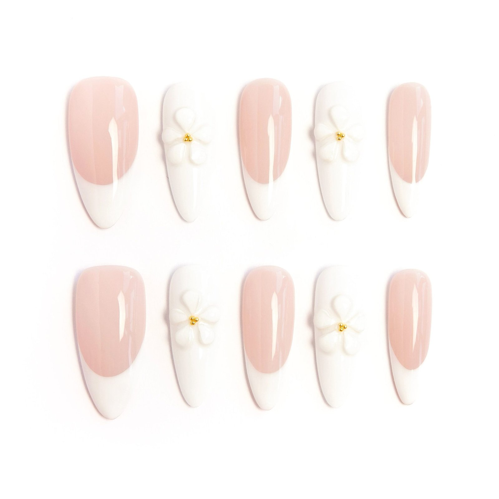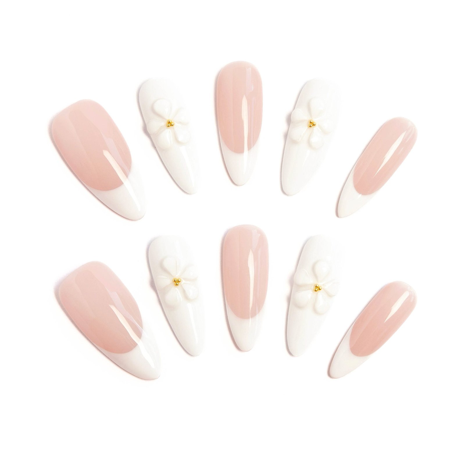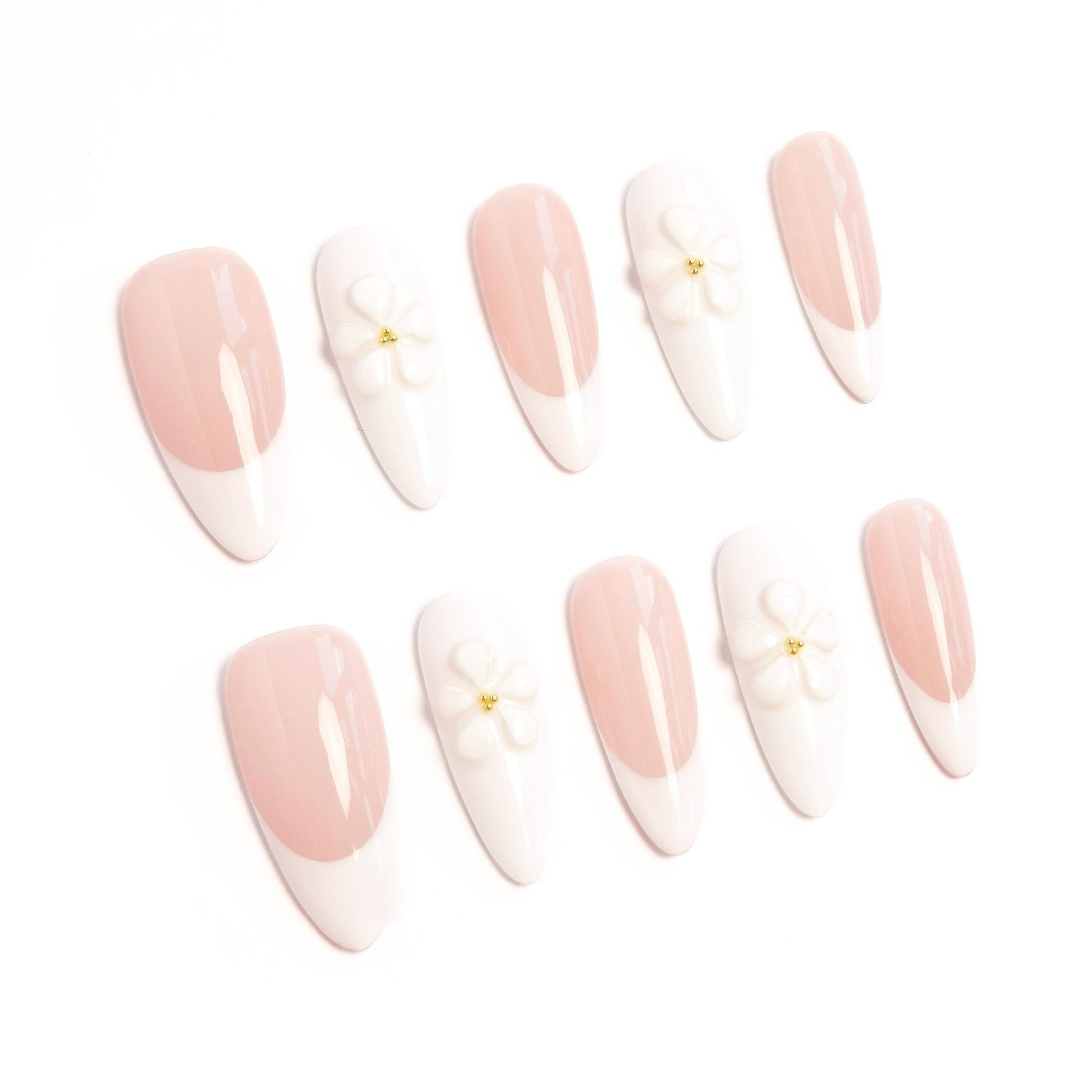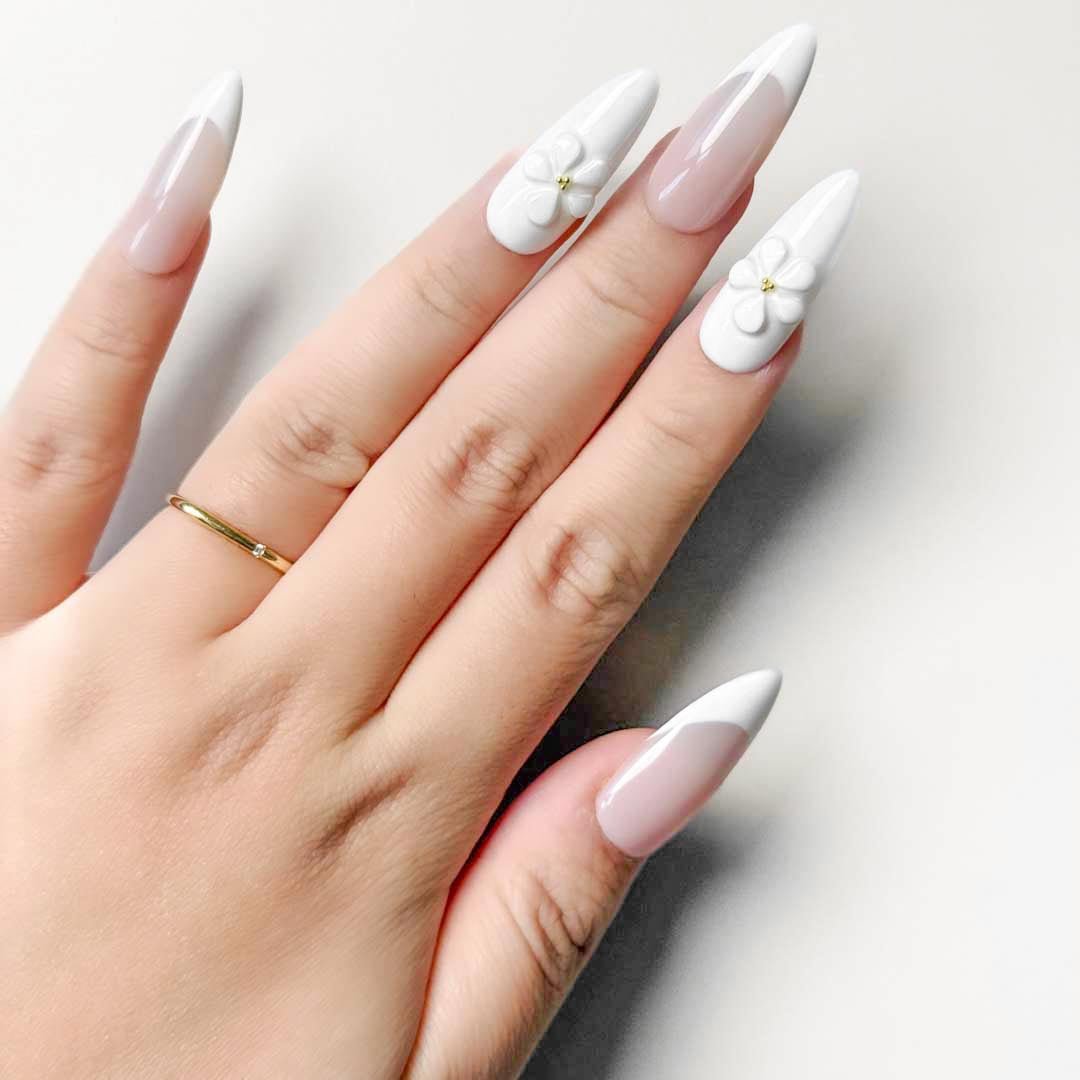 Sheer blush French tips meet ivory bases, 3D pearl-white blooms with gold centers — glimmering like morning mist over a bride’s lace veil.