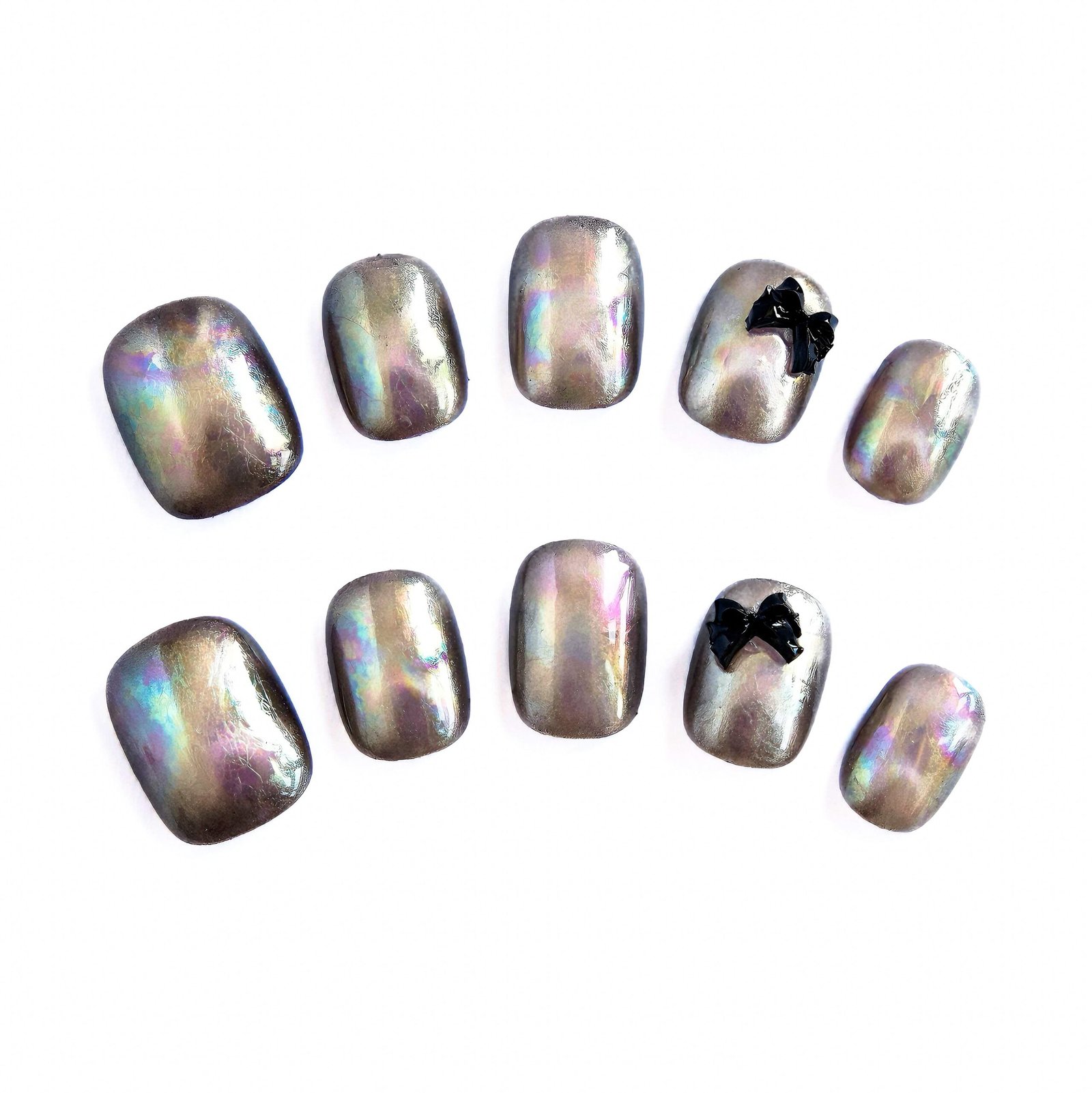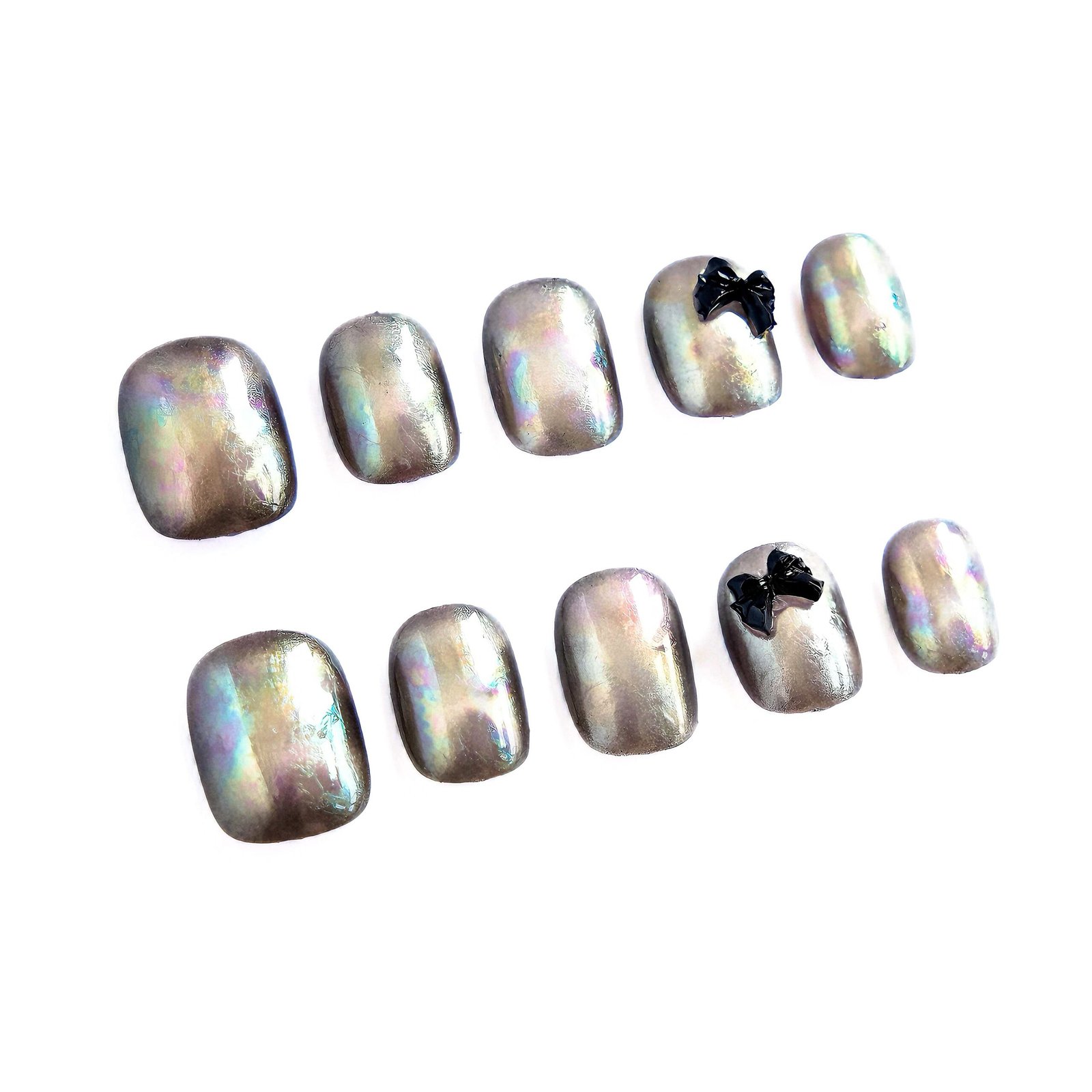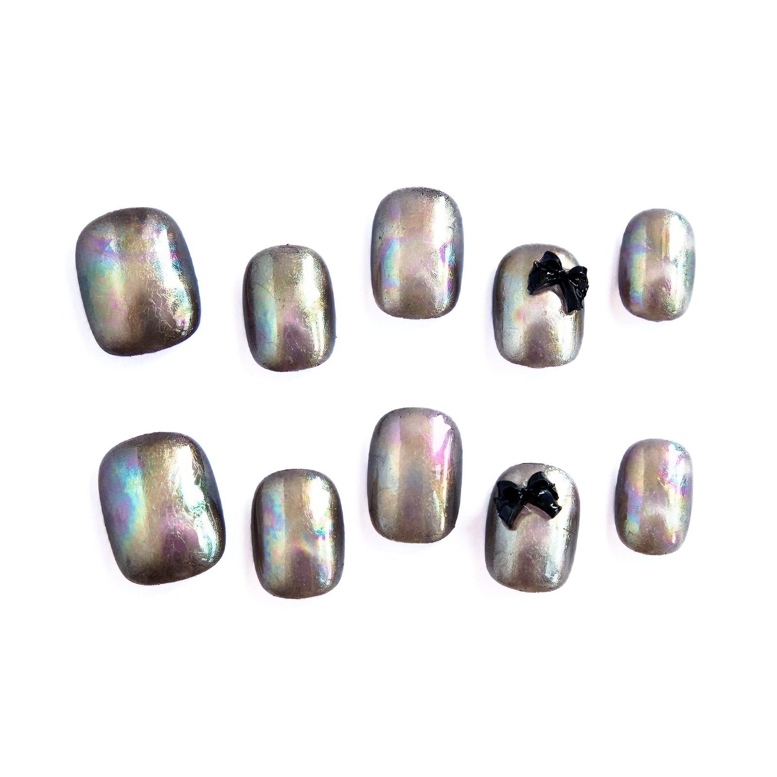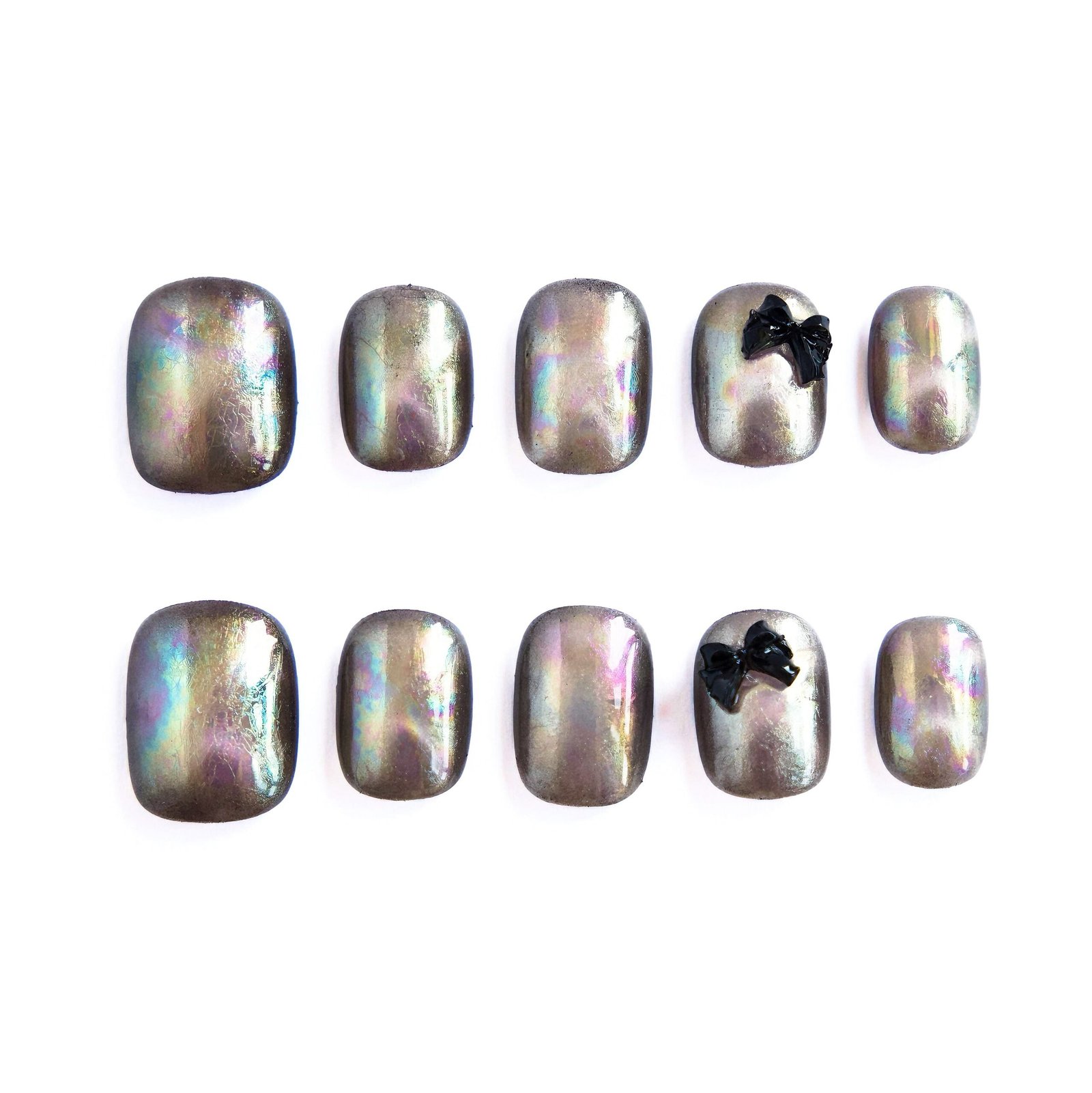 Iridescent gunmetal bases shift with rainbow hues, paired with glossy black bows — glowing like moonlit butterfly wings dusted with night dew.