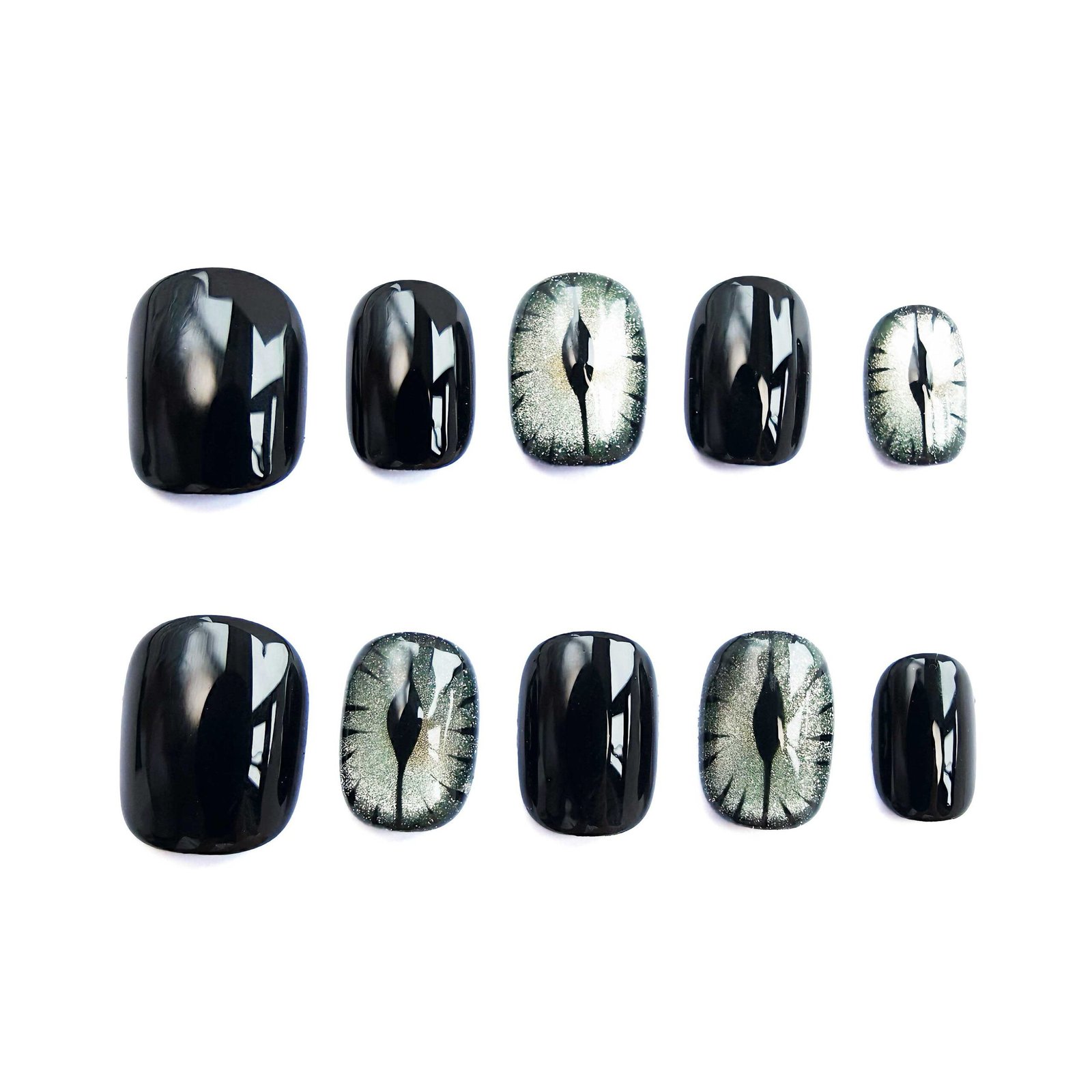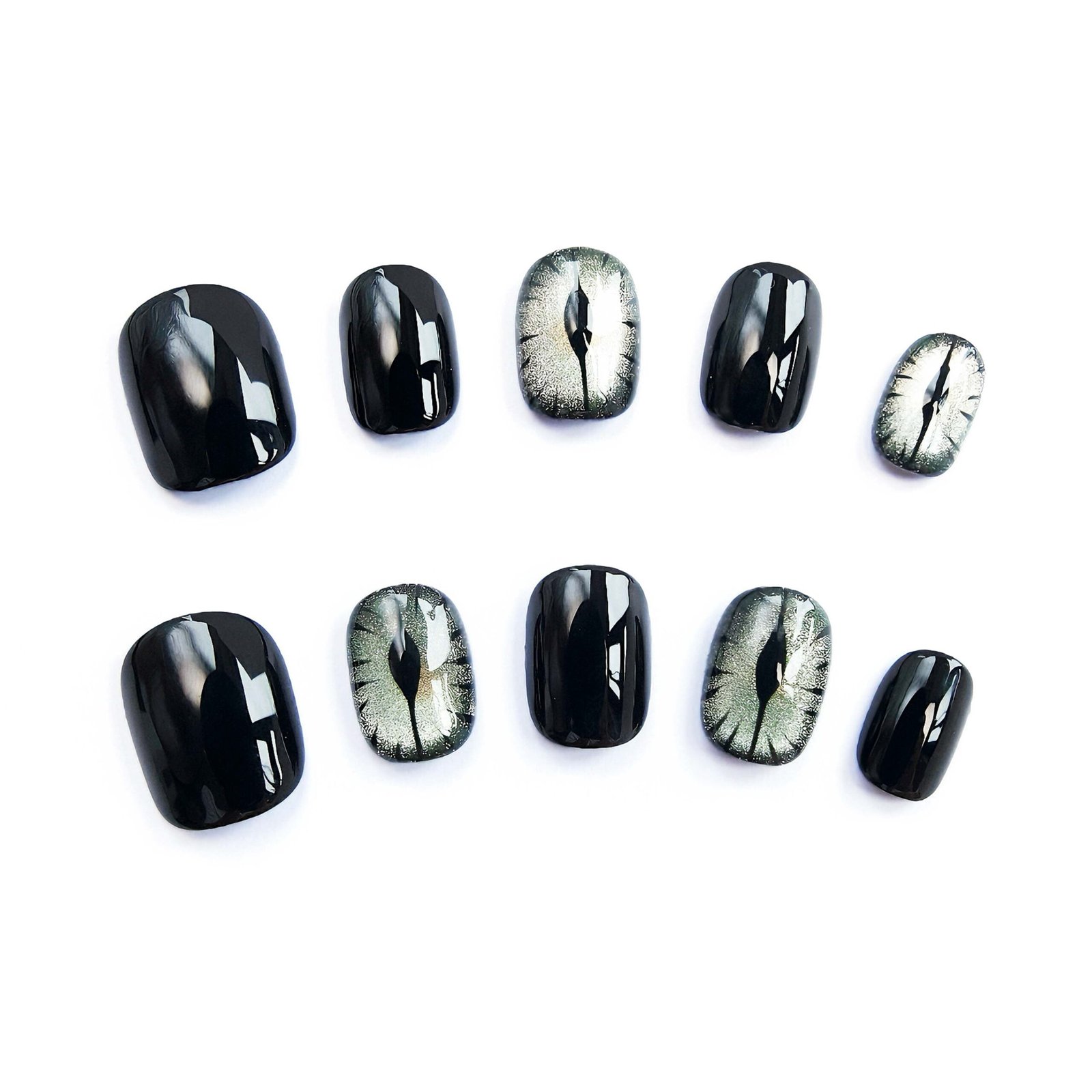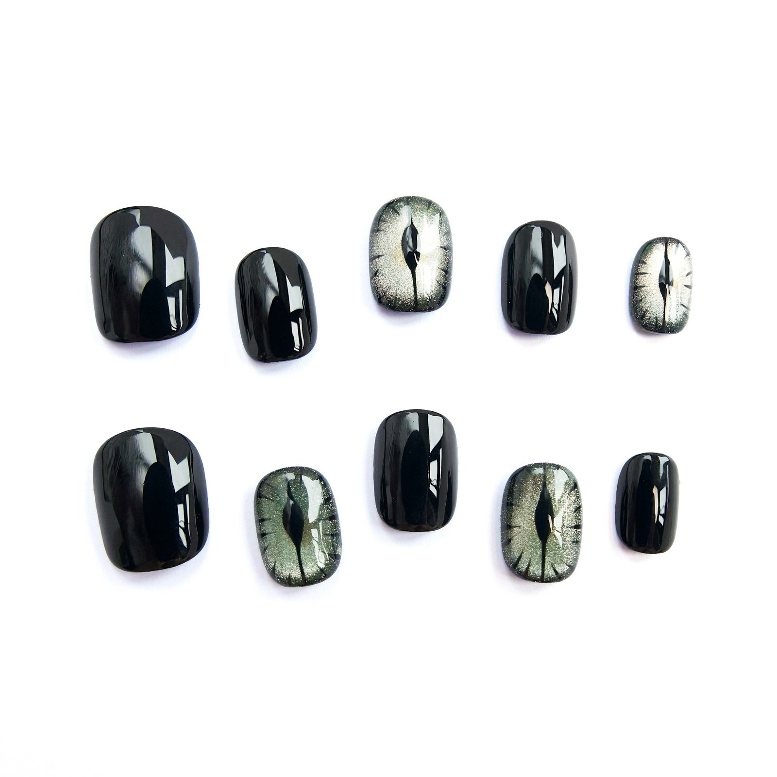 Jet-black lacquer meets shimmering cat-eye gleams — like obsidian eyes watching over gothic midnight, edged with star-dust silver.