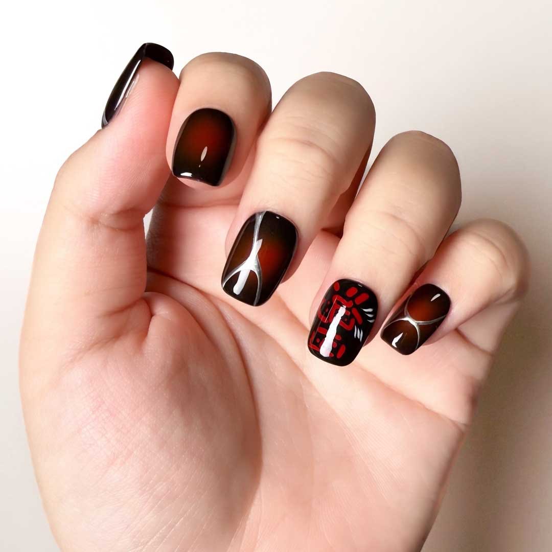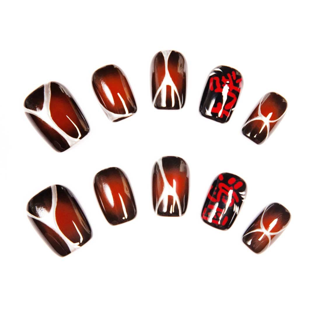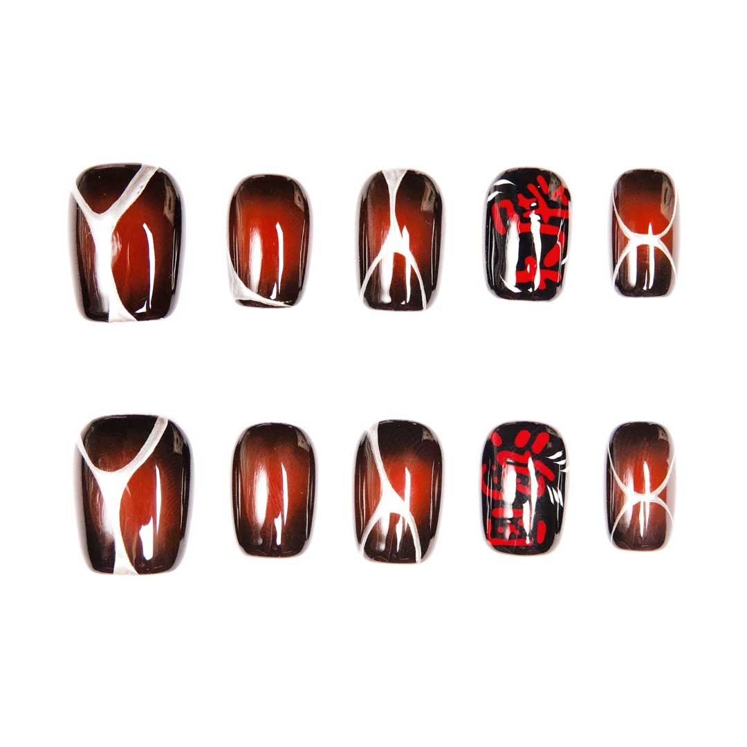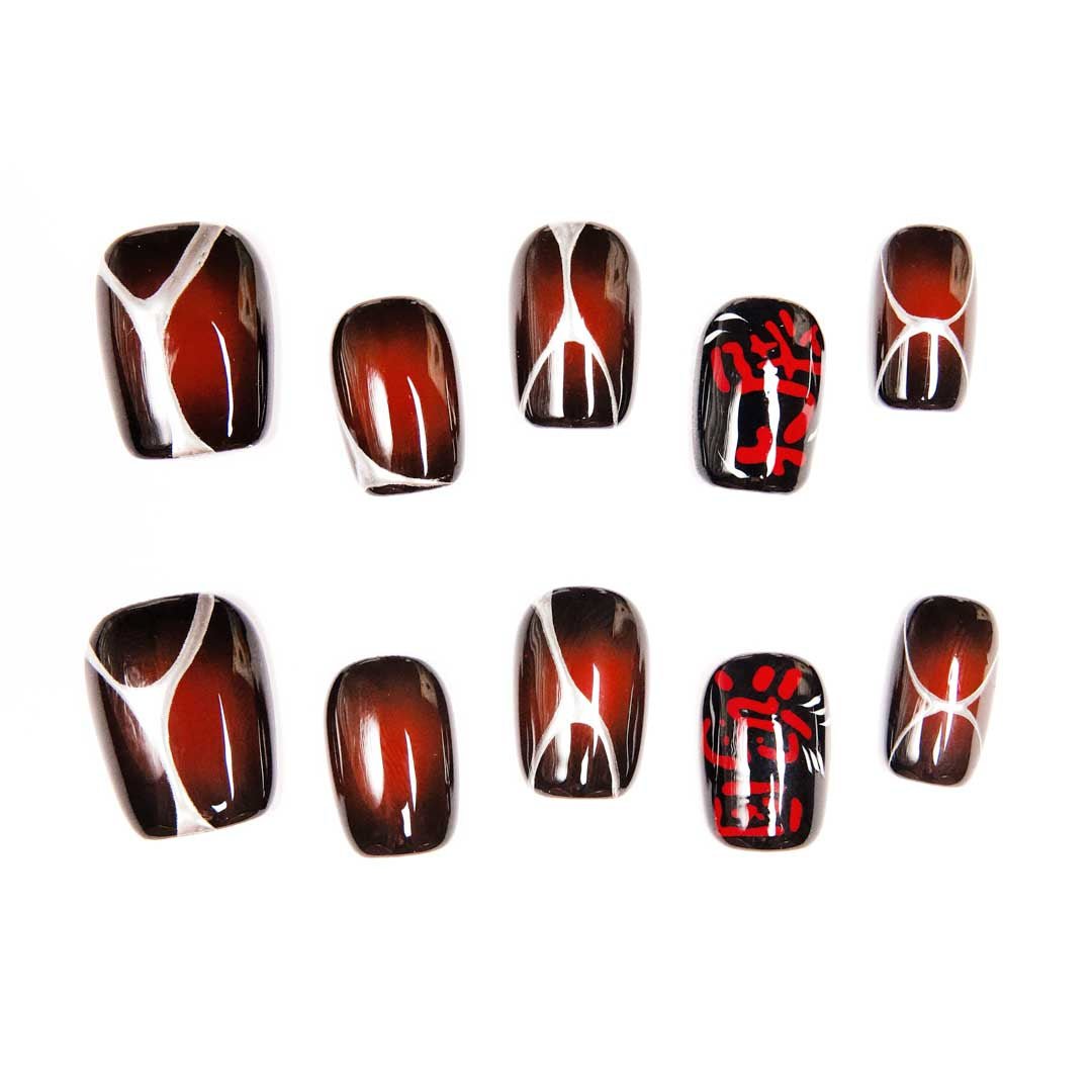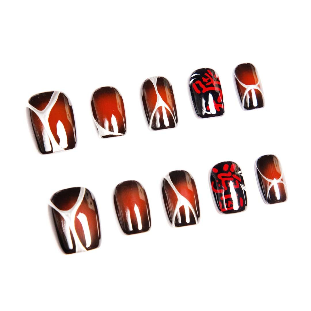 Hand-painted white brushstrokes and red calligraphy dance on amber-burgundy gradient bases. Each set is an East-meets-modern luxury relic—turning fingertips into a gallery of oriental art.