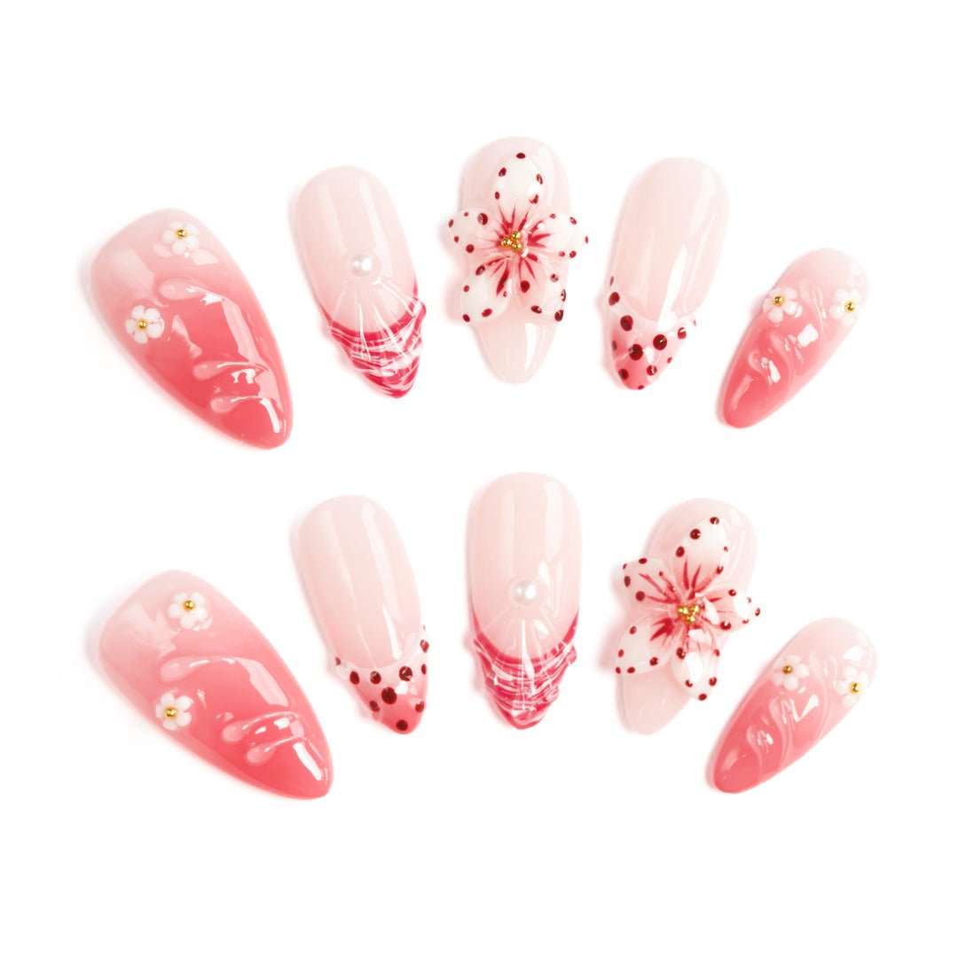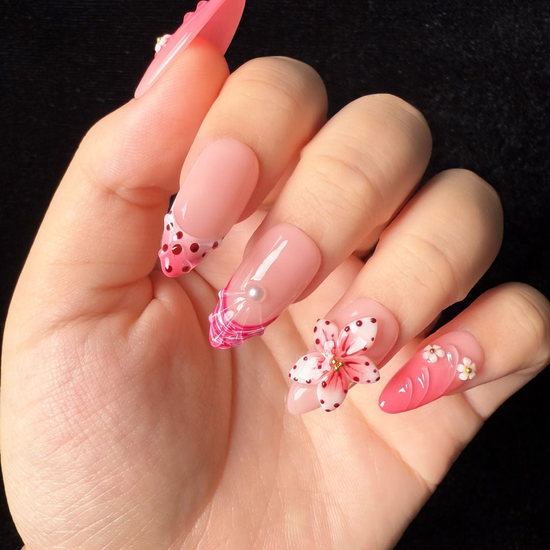 Pink gradients melt like sakura mousse on nails, with 3D white flowers, pearl crystals, and polka-dot plaid woven into glass-like reliefs. Each nail holds the sweetness of a spring candy jar—when you lift your hand on a date, it’s “cherry blossoms falling on fingertips”; paired with a dress at a picnic, you look like a sweet girl straight out of a manga, wearing all the charm of spring on your hands.