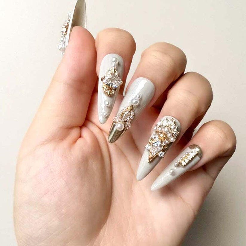 Pale grey base with gilded metal, pearls, and diamond-like accents — capturing timeless bridal grace.
