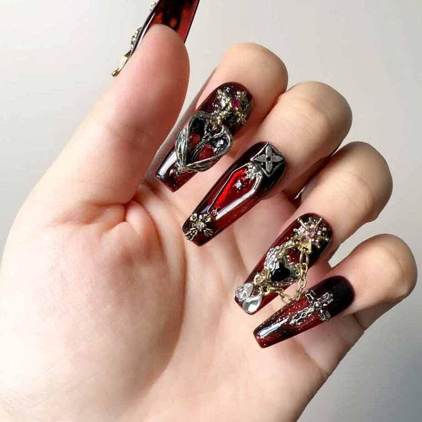Burgundy base smolders like ritual wine, gothic relics—rabbit masks, winged hearts, coffin charms—weave a darkly sacred party rite.