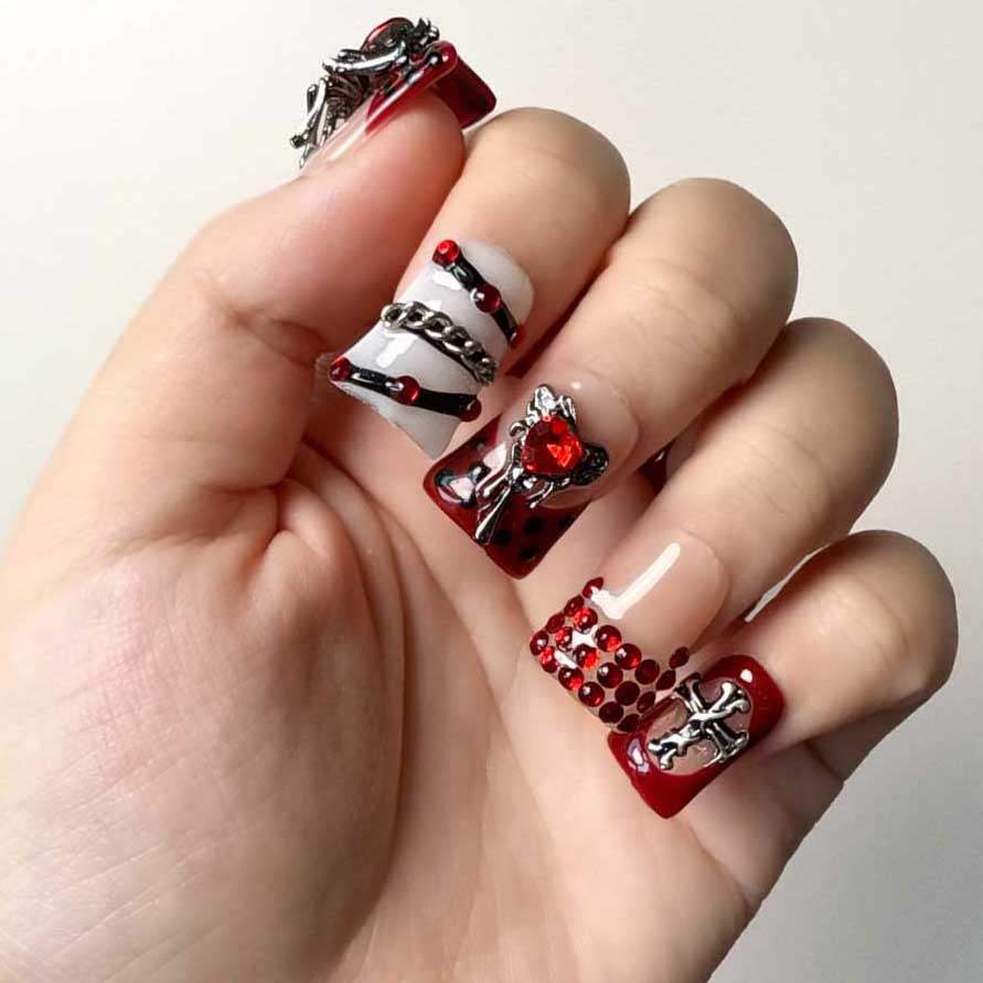 Metallic relics—angels, crosses, spiders—glow with stage-ready sheen, clashing crimson crystals and chains against ivory, scarlet, and obsidian bases. A darkly dazzling gothic-punk statement for party spotlights.