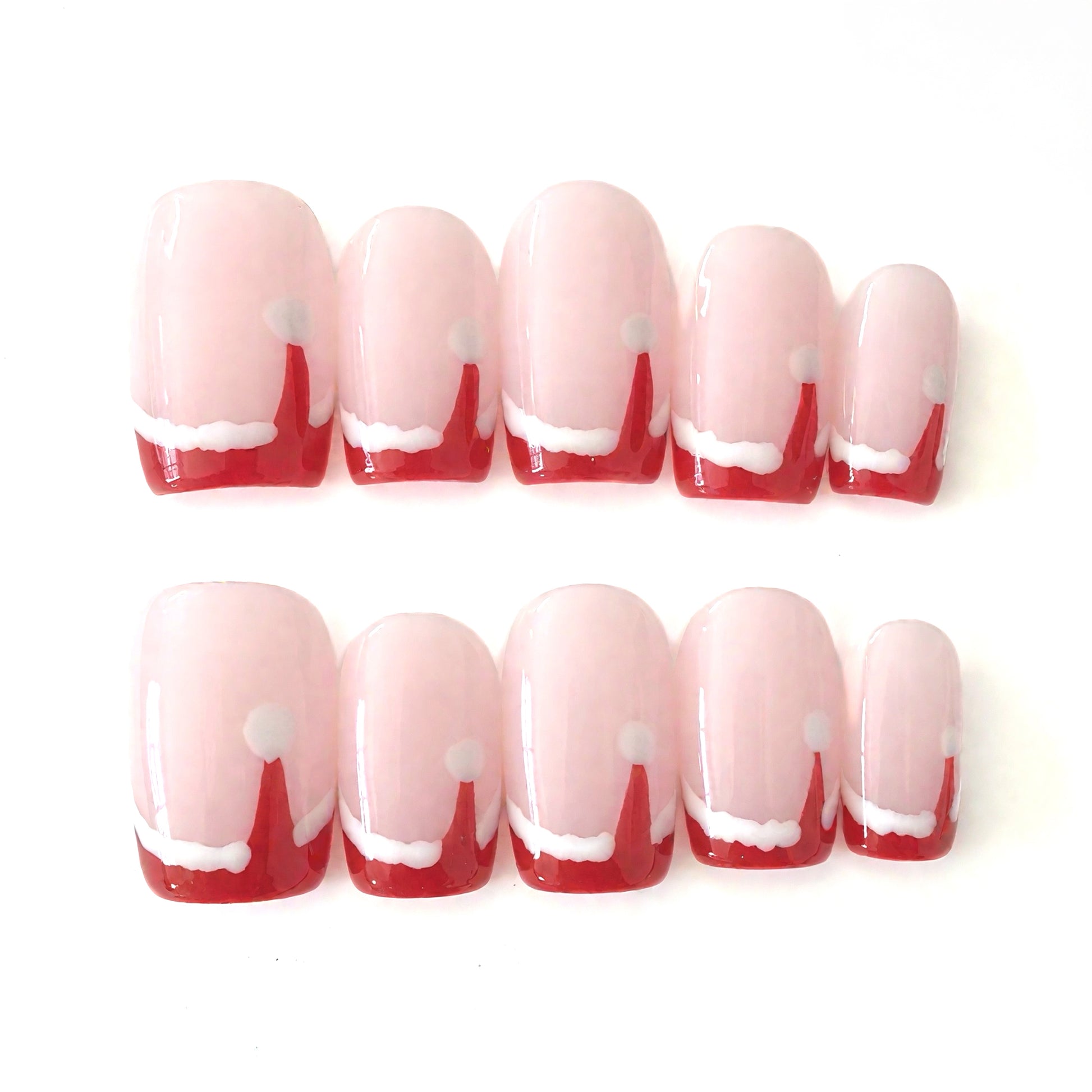 Nude blush bases with Santa hat red-and-white details drape over round nails like a Christmas fairy tale’s sweet touch. Each set is a “festive ritual” delight—no effort needed, from Christmas parties to winter dates, fingertips glow with a whimsical charm that turns everyday moments into Christmas dream scenes.