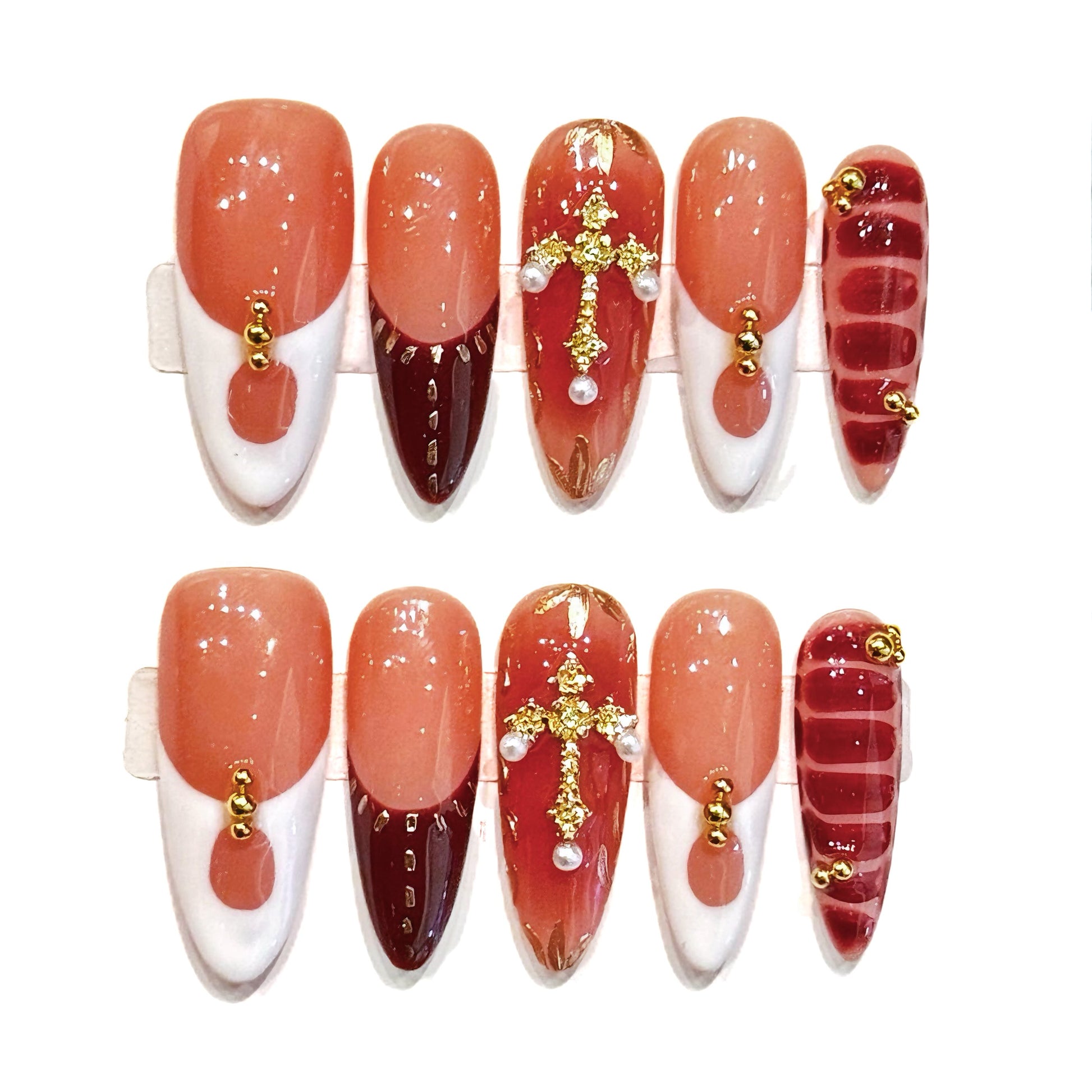 Nude brown bases paired with vintage gold crosses and pearl accents drape over sleek stiletto nails like a curated vintage jewelry box. Each set is a “retro-luxury” staple—no effort needed, from daily commutes to retro-themed parties, fingertips radiate an elegant glow that elevates everyday moments into stylish scenes.