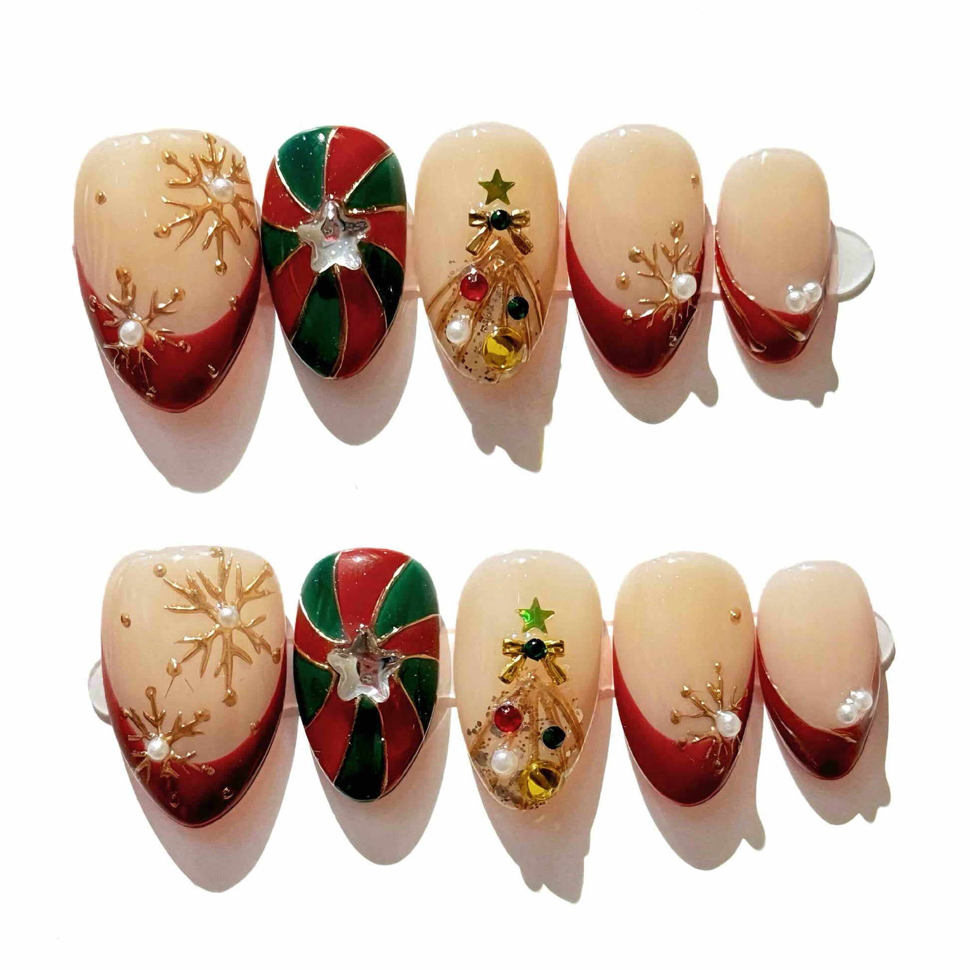 Nude brown bases paired with red-gold snowflakes and 3D Christmas trees, adorned with crystals and pearls like elegant details from a vintage Christmas gift box. Each set is a “retro-festive” staple—no effort needed, from Christmas family dinners to retro markets, fingertips radiate a vintage opulence that elevates everyday moments into Christmas retro ritual scenes.