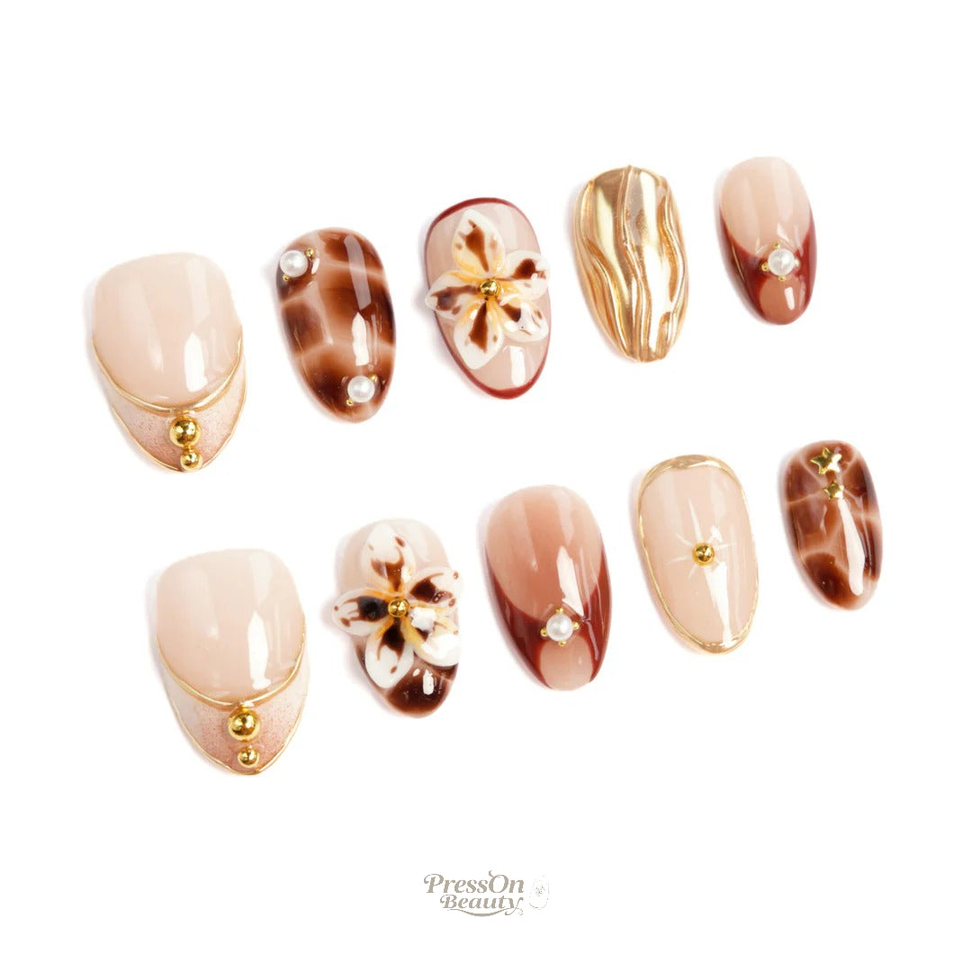 Nude pink nails inlaid with gilt patterns, deep brown tortoise shells flow like amber, and 3D flowers with pearl rivets feel like treasures from a vintage jewelry box. Each set is a “mobile art collection”—pair with a caramel coat for old-money elegance, match with a velvet dress to steal the spotlight at retro parties, or let gilt fragments subtly elevate daily commutes. A lift of the hand is “wearing a museum on your fingers” luxury.